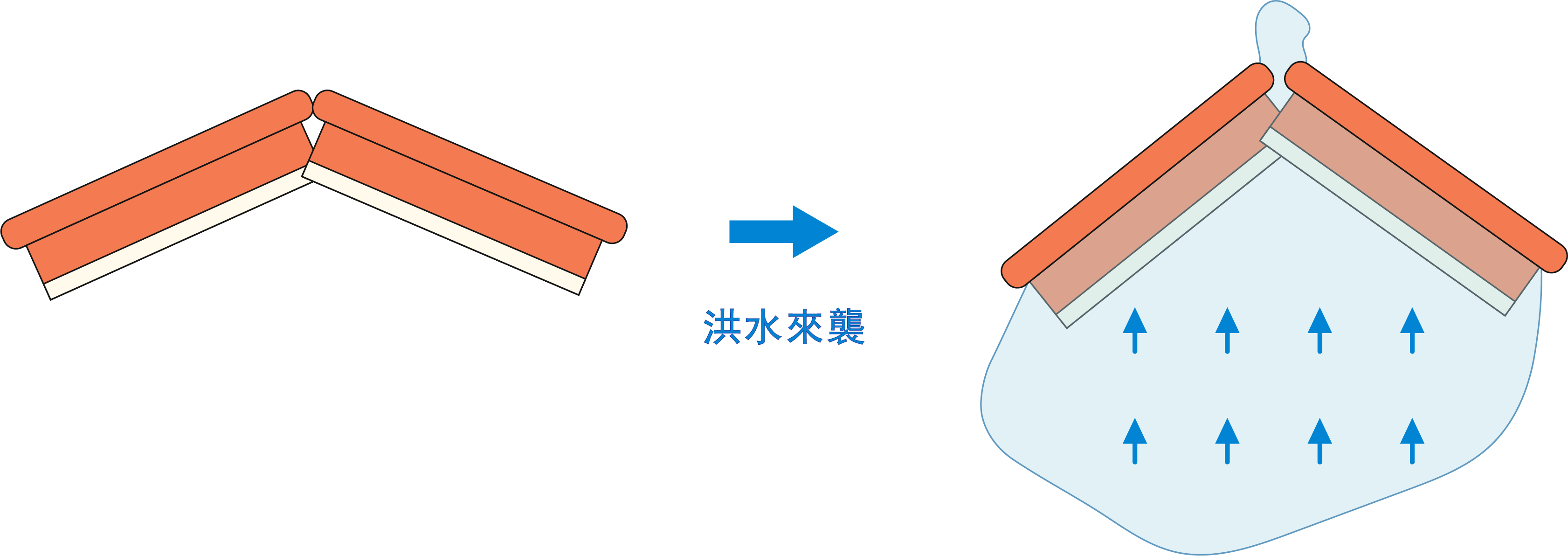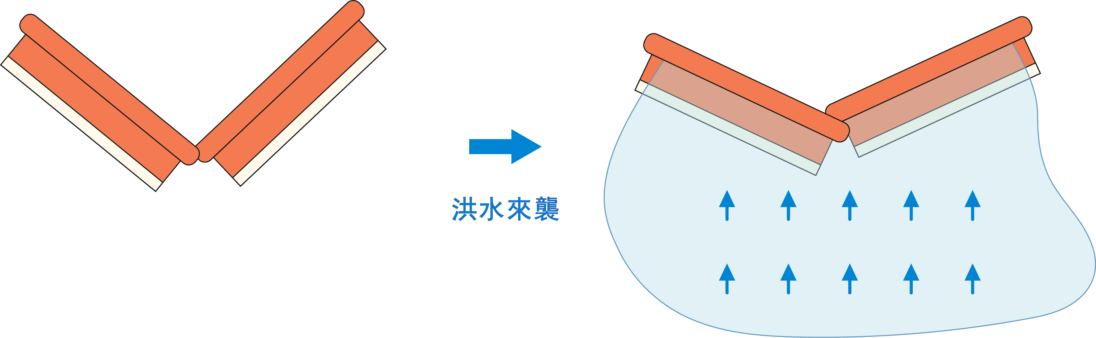 威寶防汛護盾由多節防洪牆組成, 以充氣方式在短時間內快速膨脹 , 並透過書擋原理緊密貼合地面, 形成高效的隔水屏障。
