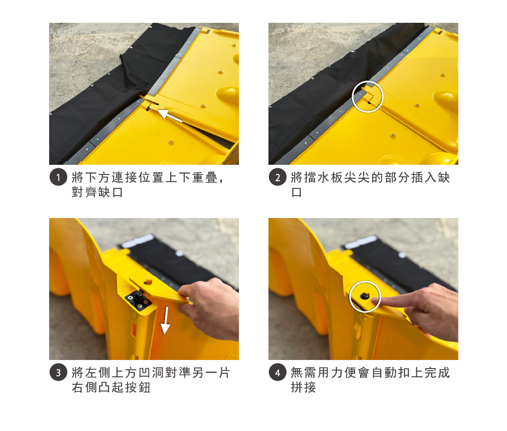 帆布內外兩側設有魔鬼氈,當多塊擋水板並排時可緊密相黏,防止縫隙滲水。