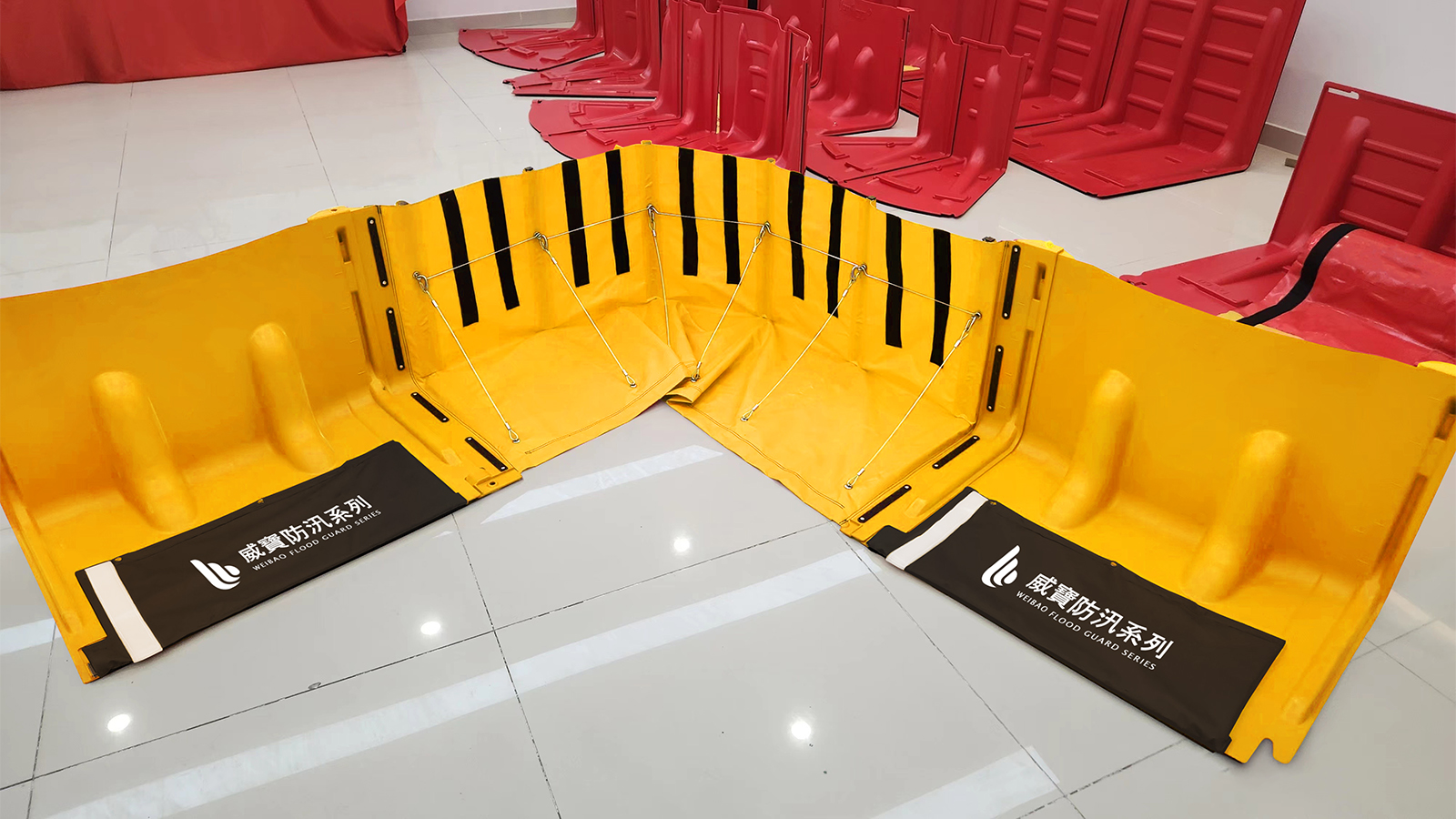 即使是洪水已達到擋板的頂部, 仍能非常穩固不會傾倒, 且水位越高, 擋水效果越牢靠。