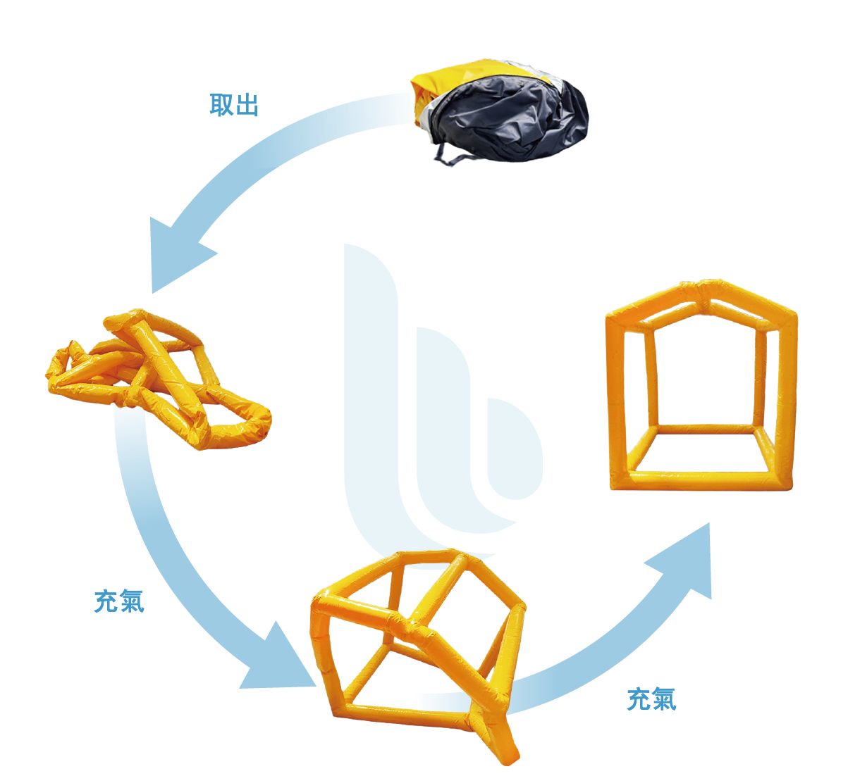 災害可能瞬間造成大量傷患或無家可歸者,可於防災準備階段預先充氣佈署,作為救災補給站或災民的暫時避難區。