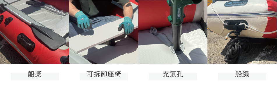 ・零件結構:兩側船槳、可拆卸座椅、充氣孔、船繩