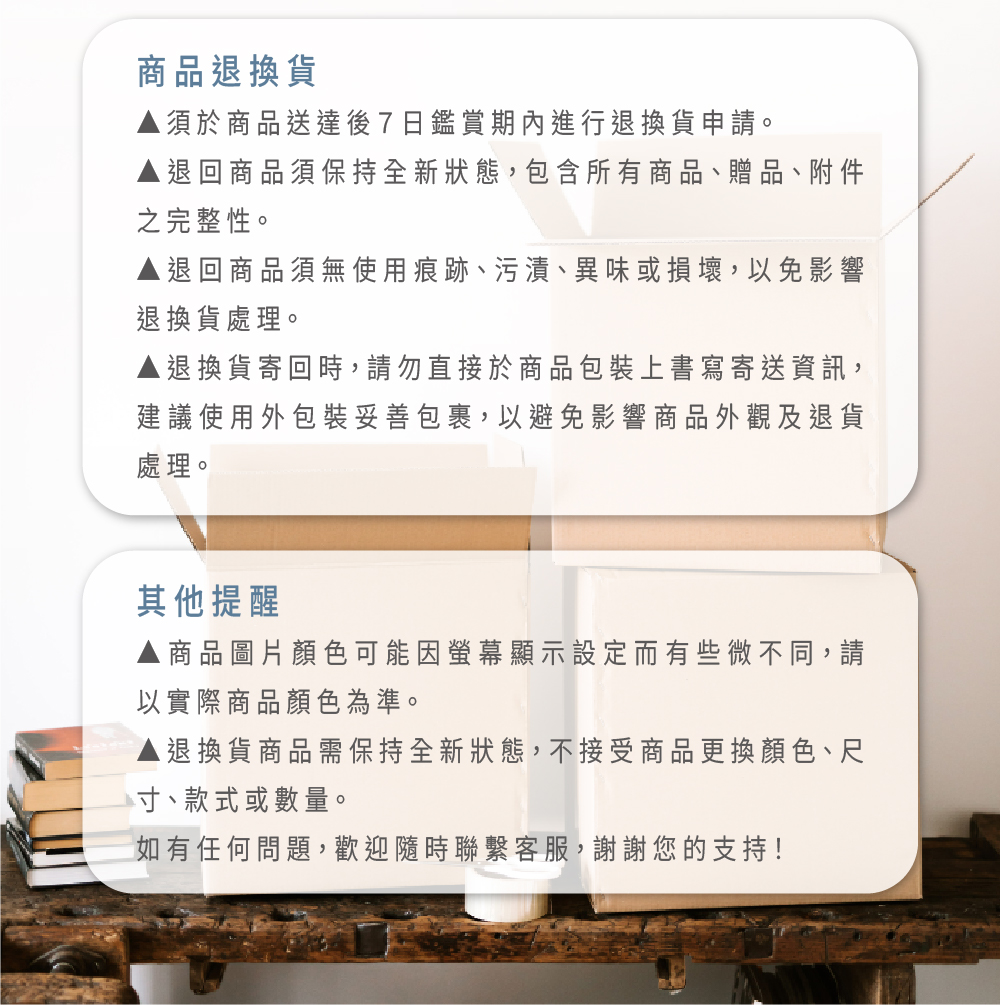 ▲退/換貨商品退回時,必須保持全新狀態,包括所有商品、贈品、附件之完整性,不接受部分退貨。